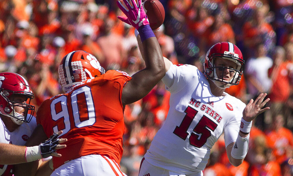 Clemson’s D-Line vs. State’s O-Line: This might be one of the best matchups in college football today. Clemson, led by defensive tackles Christian Wilkins and Dexter Lawrence and defensive ends Austin Bryant and Clelin Ferrell, leads the nation with 32 sacks. NC State on the other hand ranks ninth in the country in sacks allowed with nine and is led by left tackle Tyler Jones (6-3, 300) and center Garrett Bradbury (6-3, 298). However, Clemson’s fearsome foursome owns 16.5 of the defense’s 32 sacks. A big challenge for an NC State line that has played teams that have had issues getting to the quarterback. South Carolina has just 17 sacks this year, while Marshall has 23, Florida State 11, Syracuse 10, Louisville 17, Pittsburgh 14 and Notre Dame 19. The Tigers also rank eighth nationally with 67 tackles for loss, while NC State has allowed 49 tackles behind the line of scrimmage. So the Tigers will have an opportunity to make some plays in the backfield this afternoon. Advantage: Clemson