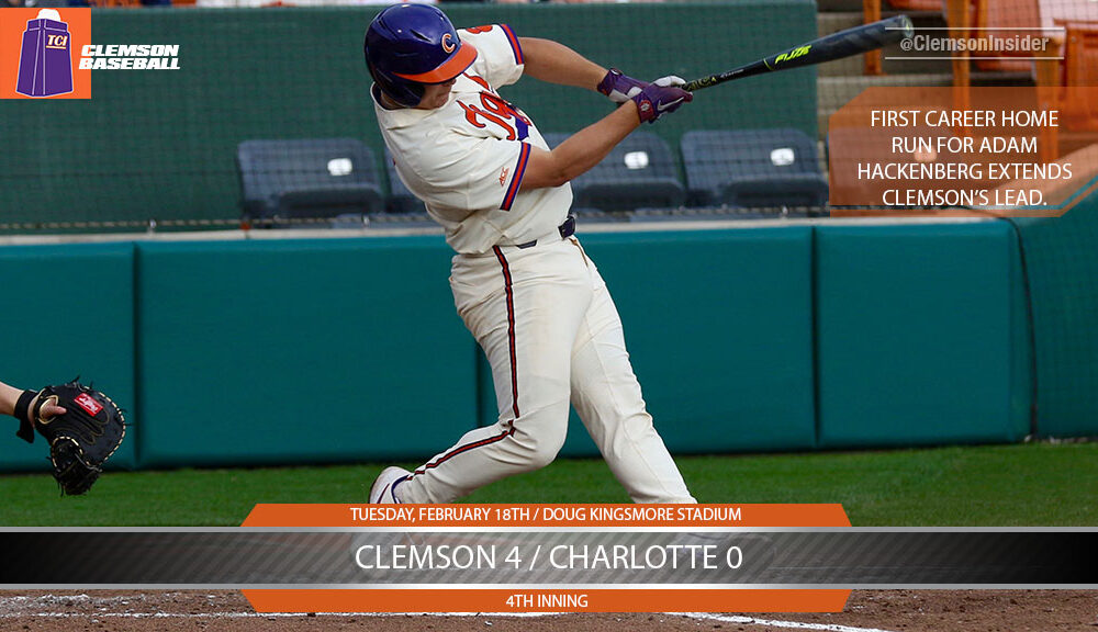 Clemson continued to use the long ball and jumped up 4-0 on a two-run shot by Adam Hackenburg in the bottom of the fourth.