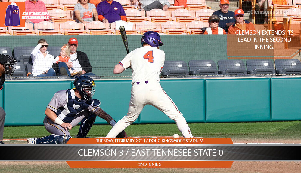 Bryce Teodosio led off with a single, stole second base and reached third on a wild pitch. After Sam Hall walked, both Hall and Teodosio advanced on a sacrifice fly by Logan Davidson that scored Teodosio and put Clemson up 2-0. Grayson Byrd bumped the lead to 3-0 on an RBI single giving the Tigers a 3-0 lead after two innings.