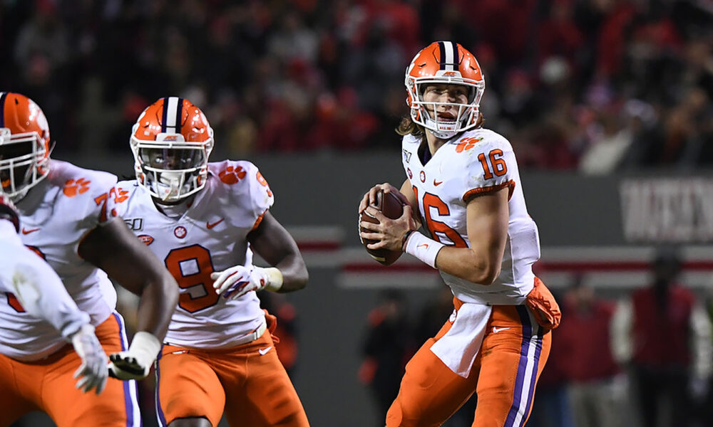 Trevor Lawrence used his legs on a zone-read running play and scored from 17 yards out to put the Tigers back in front, 10-7, with 12 seconds left in the opening period Saturday night at Lane Stadium in Blacksburg, Va.