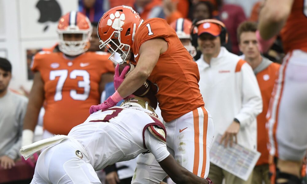 - Clemson trailed 6-3 after B.T. Potter missed on a 49-yard field goal early in the second quarter, but the Tigers got the ball right back for the offense with their first three and out of the day. Clemson then quickly got in business when Phil Mafah ripped off Clemson’s longest play from scrimmage with a 63-yard scamper that got the Tigers into the red zone. The Tigers netted just 3 yards on their next two plays, setting up third-and-7 from FSU’s 11-yard line. Clemson lined up tight end Davis Allen out wide, and Uiagalelei lofted a pass his way toward the back corner of the end zone. Davis came down with it to give the Tigers a 10-6 lead with 8 minutes, 28 seconds left in the first half.