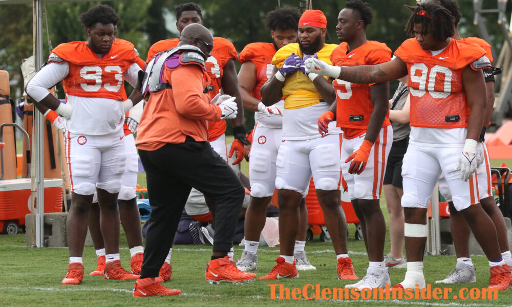 CLEMSON — Dabo Swinney made a classic move Thursday, heading out to Jervey Meadows for the sixth day of Clemson football’s fall camp. This also marked the first day of full pads for the team. The rain didn’t shy away the Tigers, and here’s all the notes on the defensive side, including a ton of pass rush success.