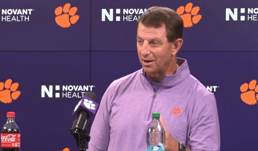 CLEMSON — Clemson head coach Dabo Swinney met with the media on Tuesday for his weekly press conference at the Smart Family Media Center.