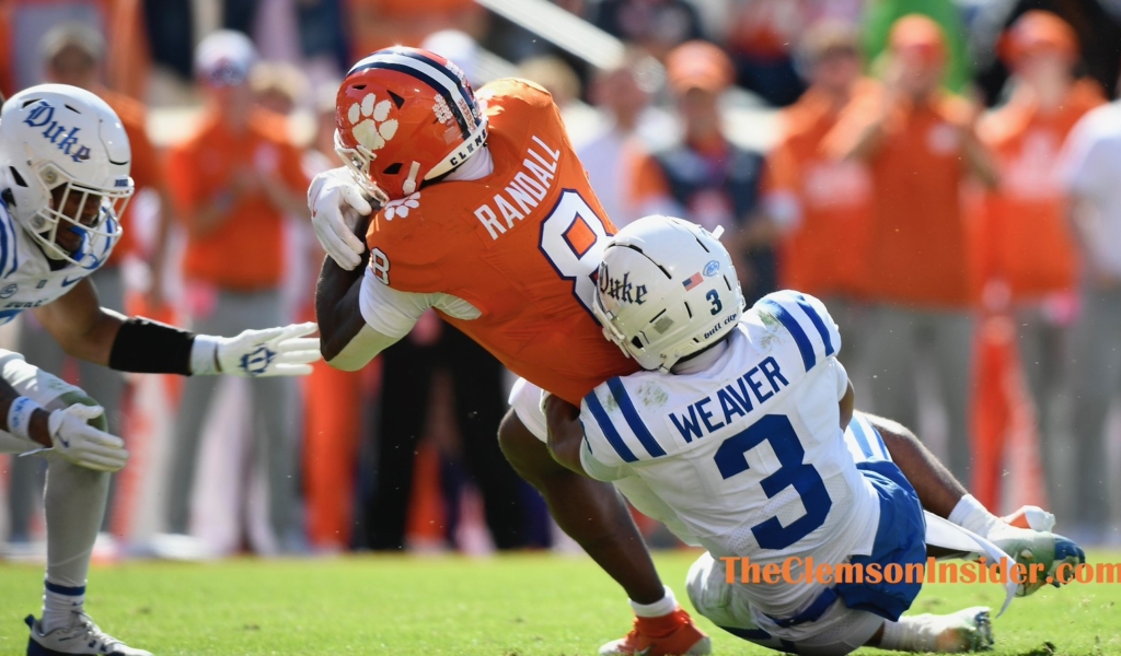 CLEMSON – The Clemson Tigers evened the score against the Duke Blue Devils for the second time in the first half with a two-yard rush into the end zone to make the score 21-21.