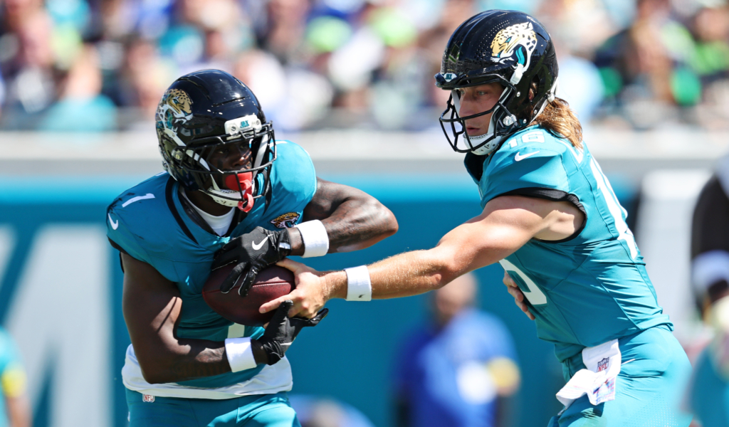 In addition to his TD passes of 20, 8 and 45 yards to Etienne, Lawrence threw a 4-yard TD to Brian Thomas Jr. and a 16-yarder to Bhayshul Tuten.