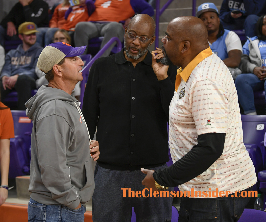 Clemson head football coach Dabo Swinny (left) talks with Elden Campbell (center) as the Tigers played North Carolina on Monday, February 10, 2025 at Littlejohn Coliseum in Clemson. (Bart Boatwright/The Clemson Insider)