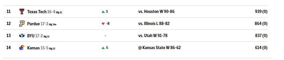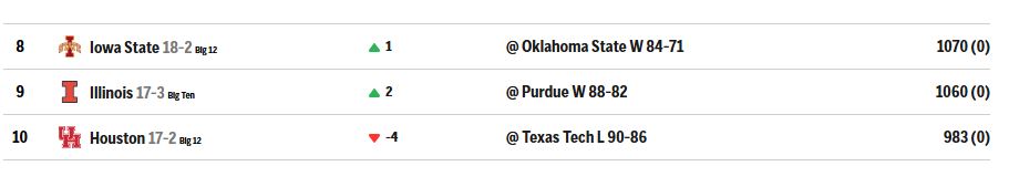 | 9 | Iowa State | 18-2 | 524 | 0 | 9 | – | 2/18 |