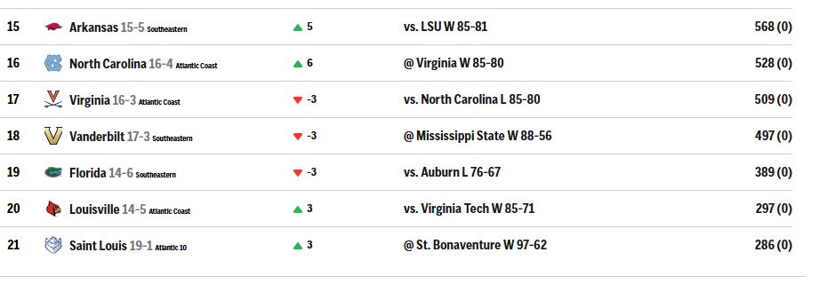 | 22 | Saint Louis | 19-1 | 154 | 0 | 23 | +1 | 22/NR |