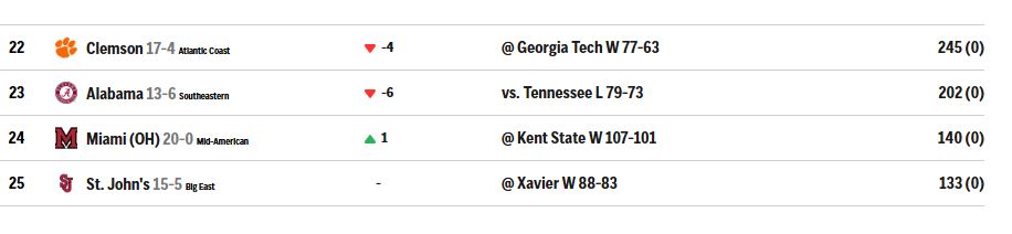 | 24 | St. John’s | 15-5 | 95 | 0 | 25 | +1 | 6/NR |