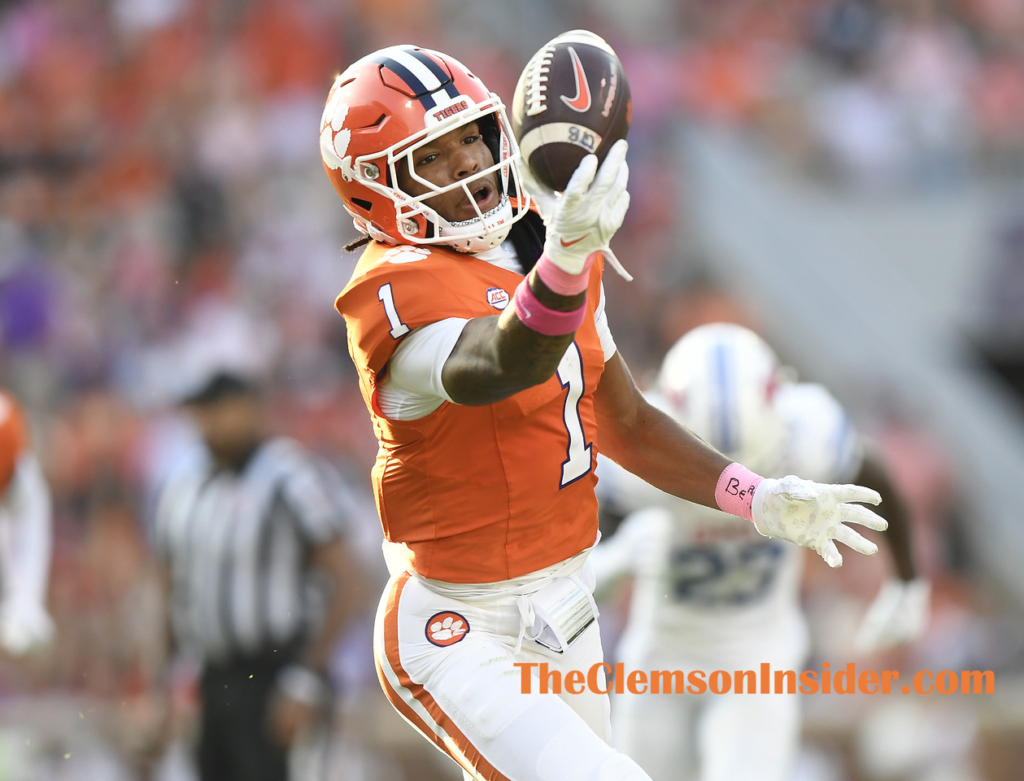 Clemson wide receiver T.J. Moore (1) makes a one handed catch to score on a 62 yard catch-and-run against SMU during the third quarter on Saturday, October 13, 2025 at Memorial Stadium in Clemson, S.C. (Bart Boatwright/The Clemson Insider)