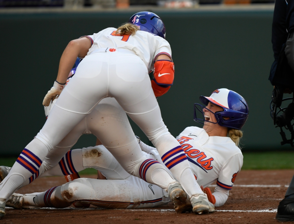 The ball got away from Willer, allowing pinch runners Sam Minish and Kylee Johnson to come home, at the same time. The two Clemson runners almost simultaneously reached home plate, just beating the throw and the tag to tie the game.
