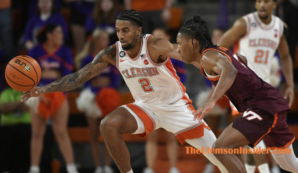 Clemson guard Dillon Hunter (2) scrambles for a loose ball with Virginia Tech guard Ben Hammond (3) on Wednesday, February 11, 2026 at Littlejohn Coliseum in Clemson, S.C. (Bart Boatwright/The Clemson Insider)