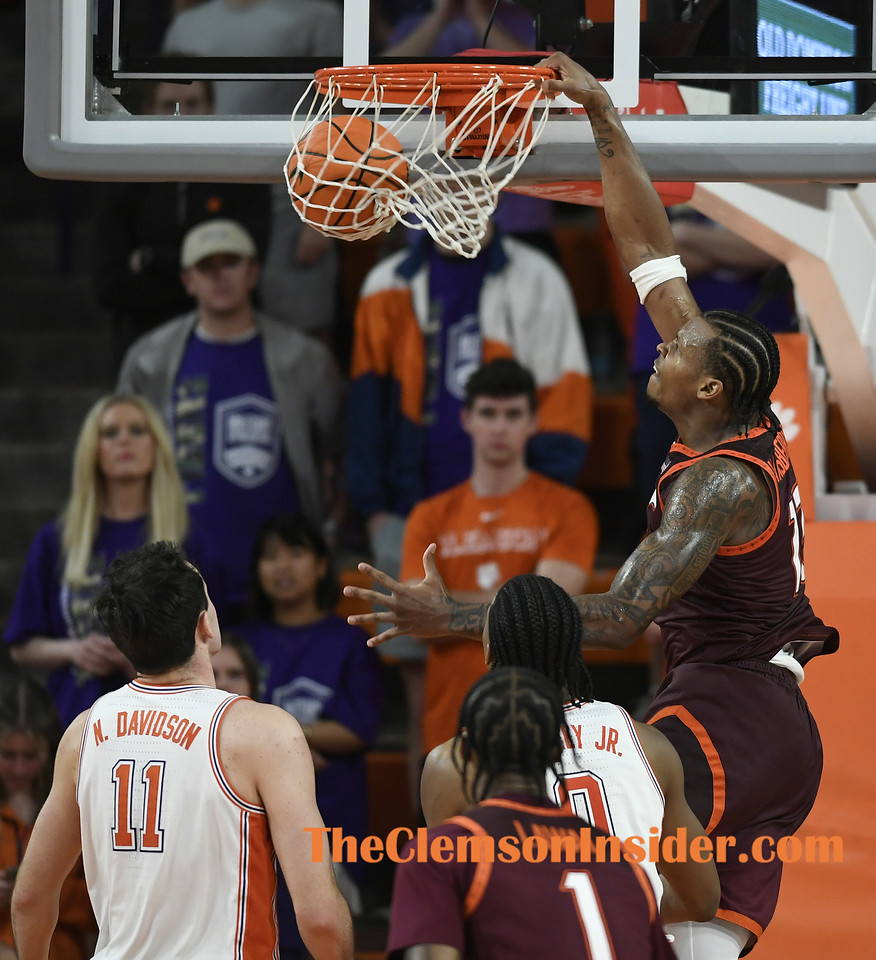 Virginia Tech forward Amani Hansberry (13) dunks over Clemson forward RJ Godfrey (0) on Wednesday, February 11, 2026 at Littlejohn Coliseum in Clemson, S.C. (Bart Boatwright/The Clemson Insider)