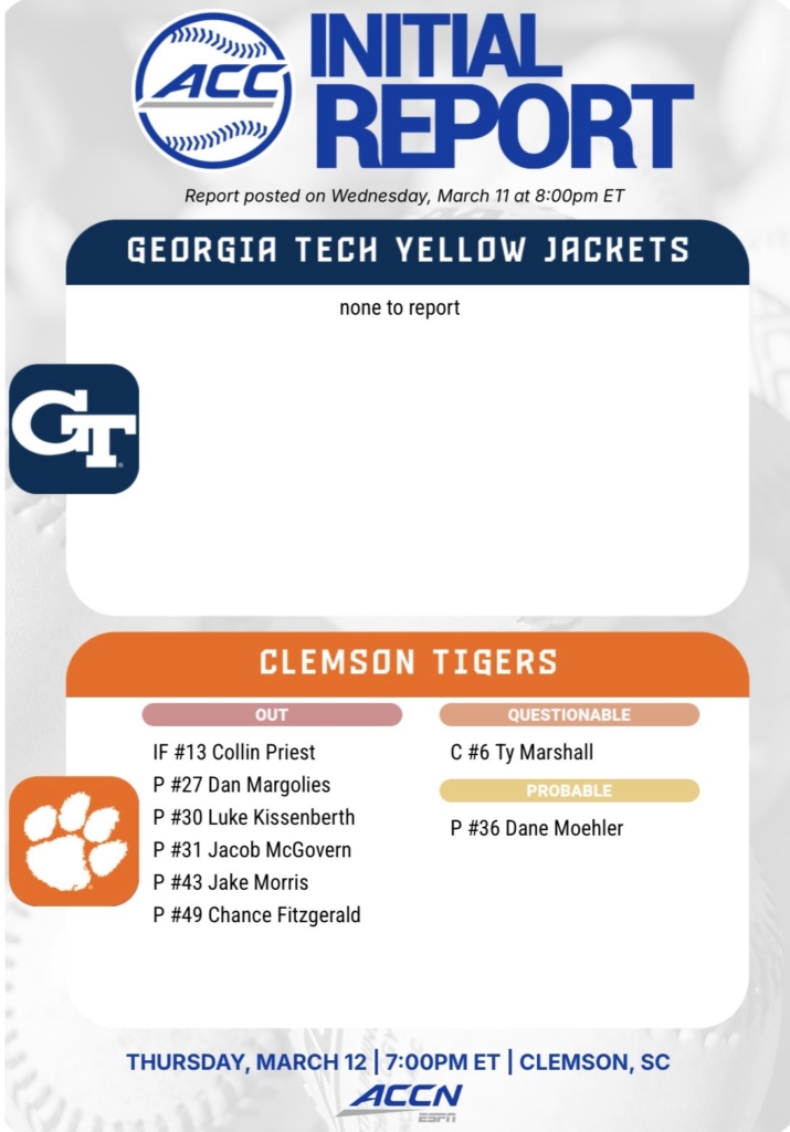 Erik Bakich’s team is dealing with a handful of injuries heading into the series, per the ACC’s Availability Report.