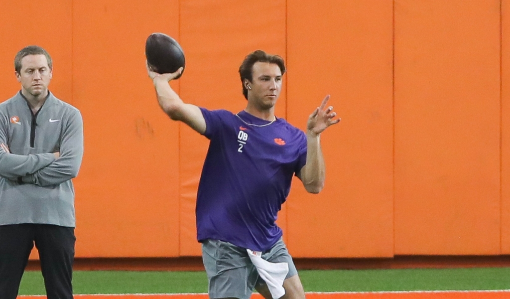 CLEMSON – It has been four years since Cade Klubnik wrapped up his high school track career, but with the crowds, warmups, and non-linear workouts, Clemson’s Pro Day reminded the quarterback of his running days.