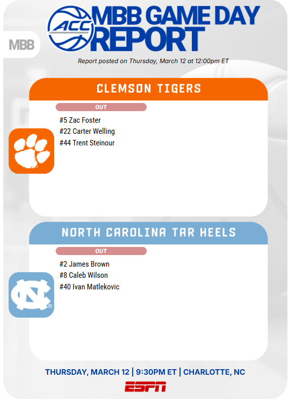 Clemson and North Carolina are scheduled to tip off at 9:30 p.m. at the Spectrum Center in Charlotte, N.C.