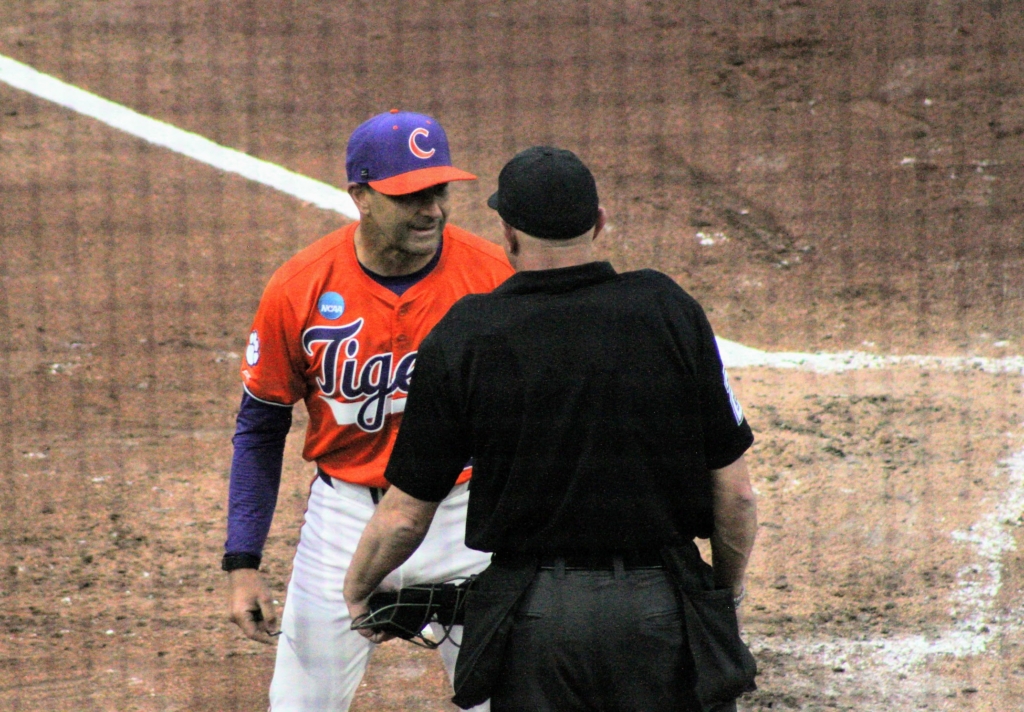 During Clemson’s next at-bat in the bottom half of the second, Clavon was on third with two outs, with Tyler Lichtenberger at the plate. Facing a 0-2 count, Lichtenberger was given a strike for not getting in the box quickly enough, ending the Tigers’ inning. Bakich was livid and came out of the dugout to argue. Once he went back to the dugout, he kept jawing and was eventually ejected. He proceeded to come back out and get in the home plate umpire’s face again.