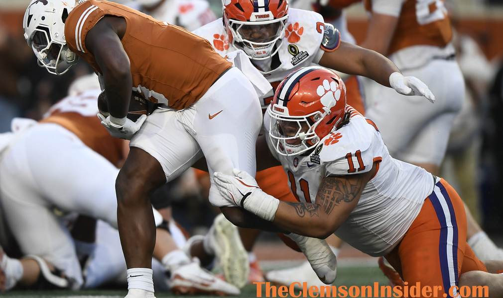 Clemson defensive lineman Peter Woods (11) and defensive end T.J. Parker (3) bring down Texas running back Jerrick Gibson (9) during the third quarter of the Tigers’ College Football Playoff game at Darrell K Royal Texas Memorial Stadium in Austin, Texas on December 21, 2024. (Bart Boatwright/The Clemson Insider)